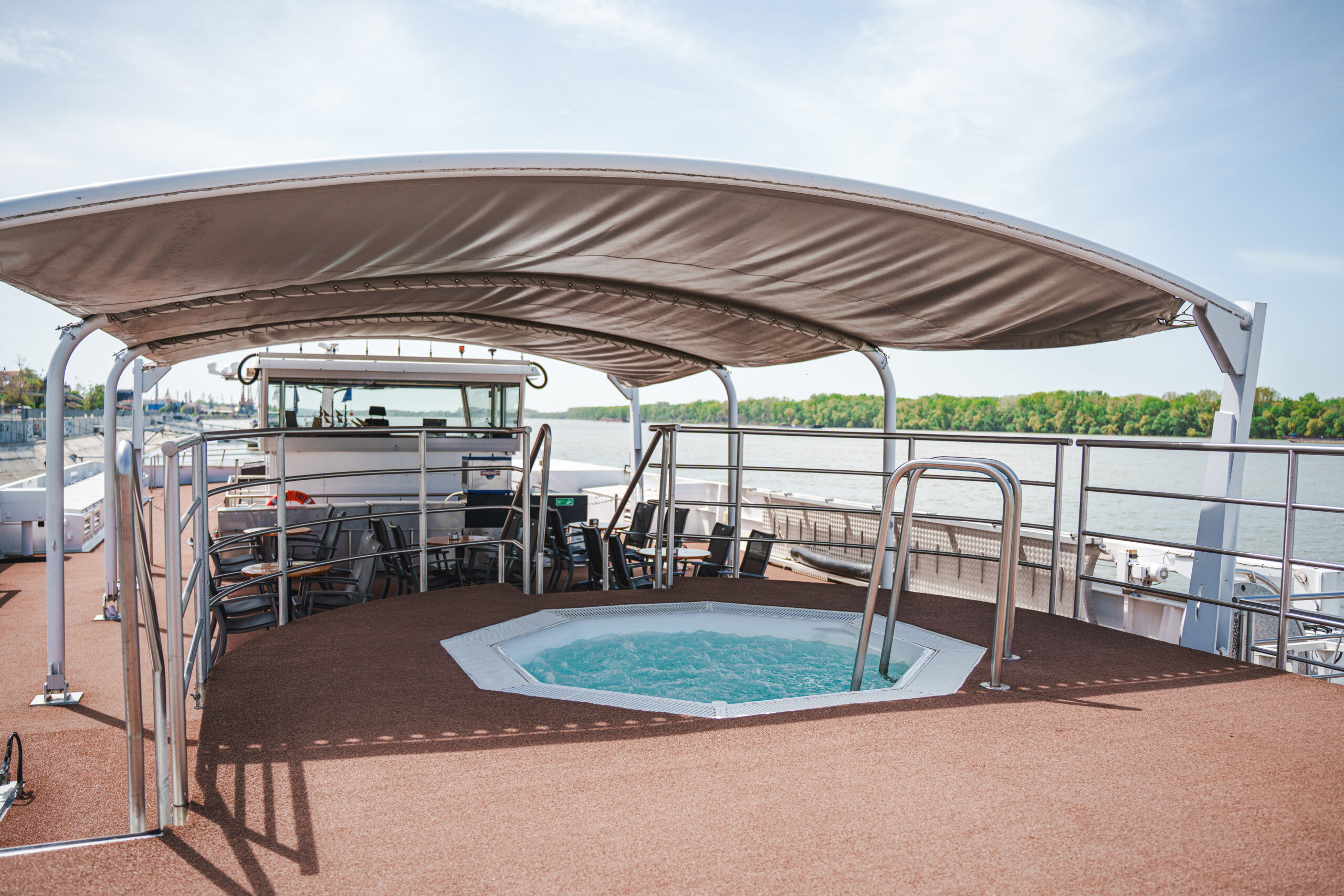 • großes Sonnendeck mit Liegestühlen, Whirlpool und Sonnenschutz